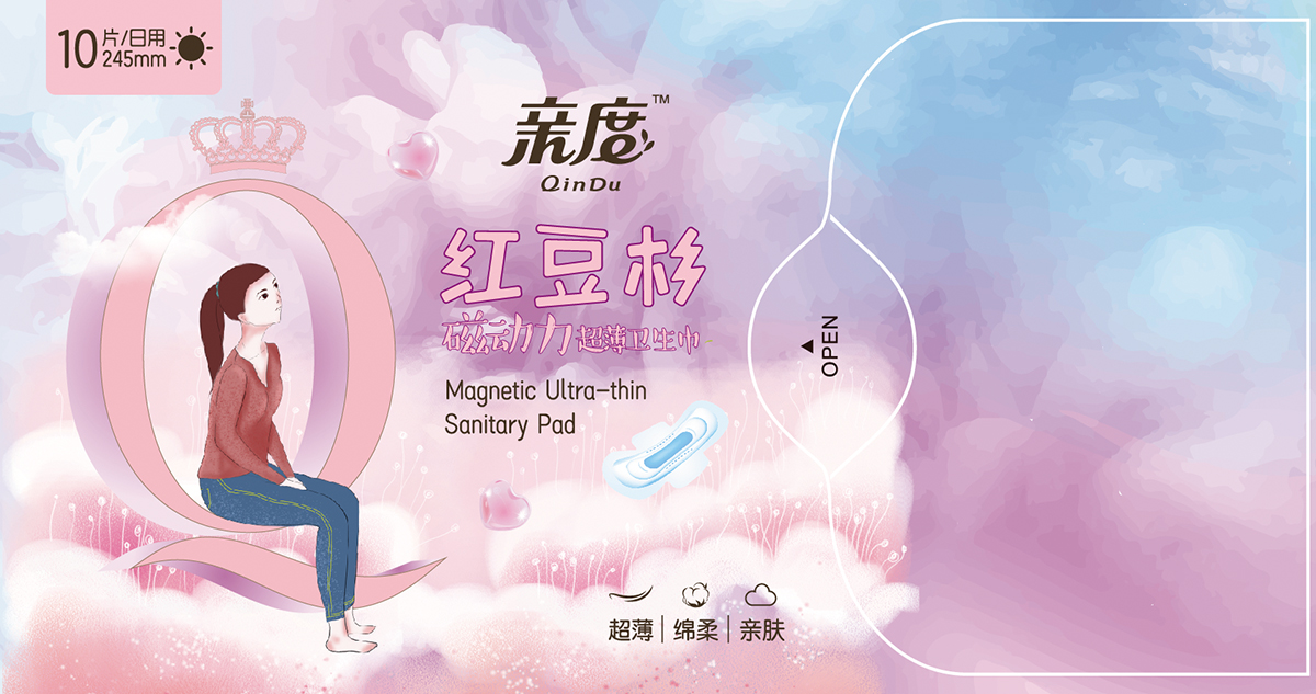 項(xiàng)目背景:親度紅豆杉磁動(dòng)力超薄衛(wèi)生巾,以每少女的卡通形象為主題的設(shè)計(jì)風(fēng)格和個(gè)性,在與同類競(jìng)品競(jìng)爭(zhēng)中脫穎而出。對(duì)于中國(guó)女孩來(lái)說(shuō),衛(wèi)生巾仍然是一個(gè)尷尬而私密的話題。因此,在衛(wèi)生護(hù)墊市場(chǎng)上,“口袋大小的包裝”的概念應(yīng)運(yùn)而生,并因其時(shí)尚的外觀和超輕便的設(shè)計(jì)而廣受歡迎。特點(diǎn):超薄 綿柔 親膚
