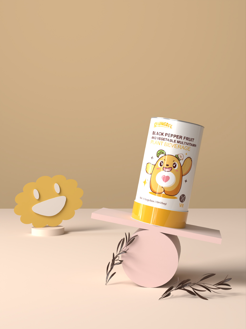 兒童營養素橙長攻略包裝設計本以“綠色環保,傳遞愛心”為主題,旨在通過可愛的卡通形象向兒童傳遞環保意識和愛心精神。主體形象是一只可愛的熊以綠色為主色調,身體上帶有愛心圖案,代表著對環境的關愛和保護。采用可愛的卡通形象,吸引兒童的注意力,讓他們更容易接受和理解環保理念。設計簡潔明了,避免過多的細節和裝飾,讓兒童能夠輕松地識別和記憶。在設計中融入一些創意元素,如將小熊的頭頂設計帶有趣味小表情的裝飾,增加趣味性和互動性。