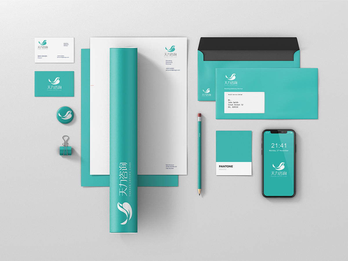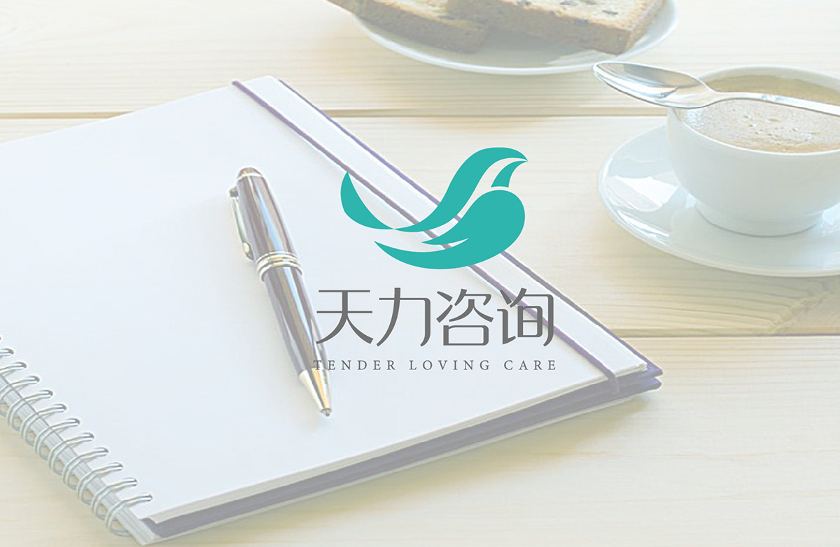 天力咨詢logo以標志以飛鳥與手為靈感,同構圖形拼搭具有設計感,以此來延伸設計。“飛鳥”代表我們奮斗的目標和高度;“手”代表我們友好的態度和親切的關懷;藍綠色的logo代表我們做事的態度和心態,與“天”的屬性相契合。整個logo切合“天力”的理念:自由飛翔的從容,發自內心的關懷,由淺入深,精益求精,追求卓越!Logo顏色以藍綠色為主調,沉穩與輕靈并重,代表了企業高尚、端莊、充滿個性的工作品質。