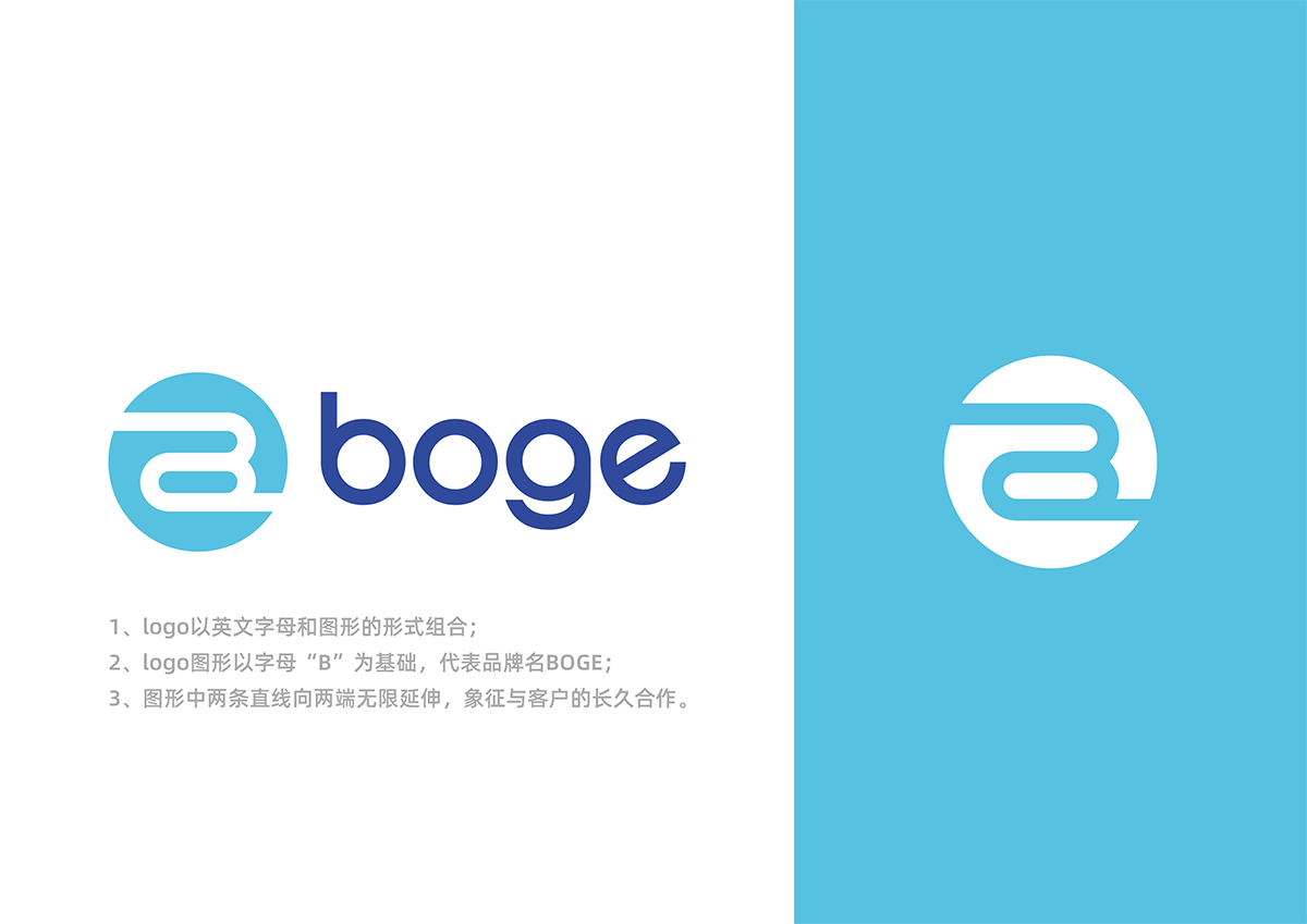 品牌介紹 :智能科技領域內的技術咨詢、技術服務、技術開發、技術轉讓;自動化設備及零配件,整體是以英文字體+圖形的方式進行的logo設計,LOGO是以B為基礎進行的延展設計,是BOGE的首字母,圖形中2條線無線延伸,寓意和客戶保持長久的合作,整體風格簡潔、科技感是具有國際范logo設計。